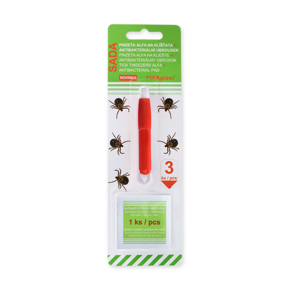 Místo, kde je klíště přisáté nejprve dezinfikujte V případě, že je přichyceno jen krátkou dobu, dezinfekce může zahubit případný virus klíšťové encefalitidy Pomocí této pinzety lehce a spolehlivě odstraníte klíště přisáté na kůži Sada obsahuje také antibakteriální ubrousky, které slouží k očištění postiženého místa Mají navíc všestranné uplatnění pro odstranění nečistot na cestách, v zaměstnání i v domácnostech